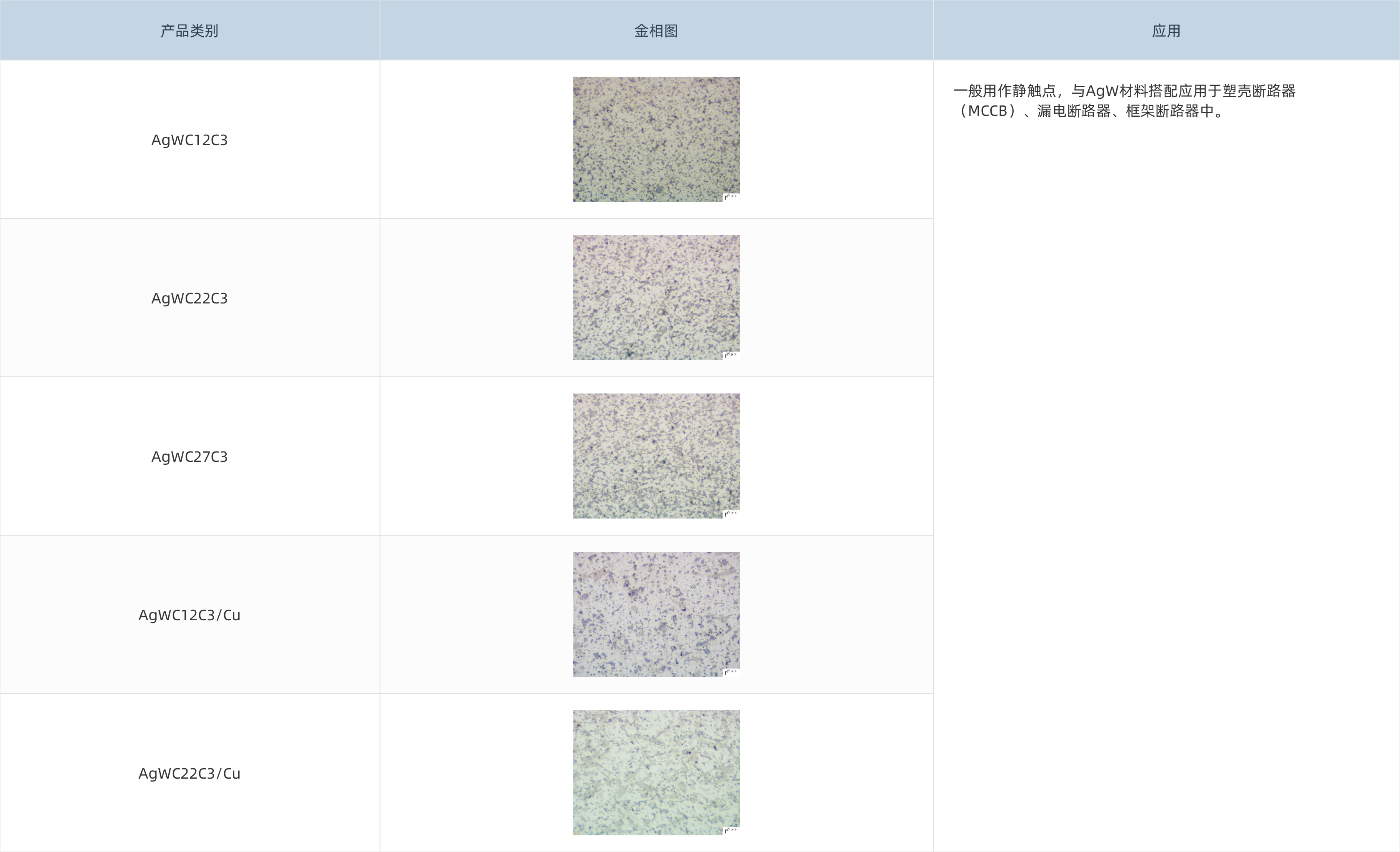 AgWCC觸點采用粉末固相燒結(jié)法制備,產(chǎn)品銀含量較高,硬度較低,具有較低的接觸電阻,第三相即石墨的加入提高了材料的抗熔焊性和潤滑性,一般用作靜觸點材料,與其他材料配對使用。